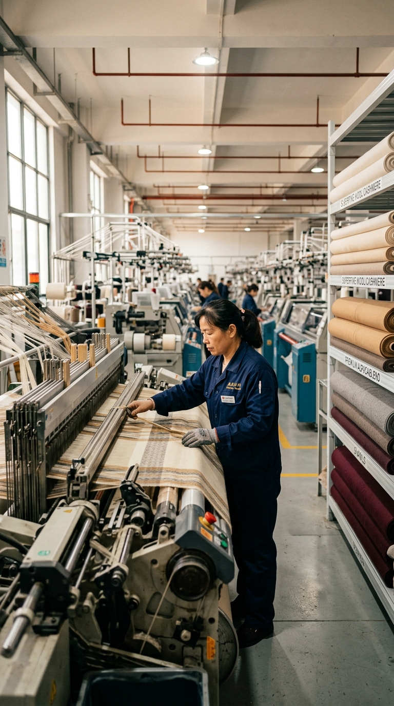 Our material library covers wool, goat cashmere, alpaca blends, camel blends, merino, Australian wool, cotton, flax, silk, and custom blanket and shawl programs for different price levels and product positions.